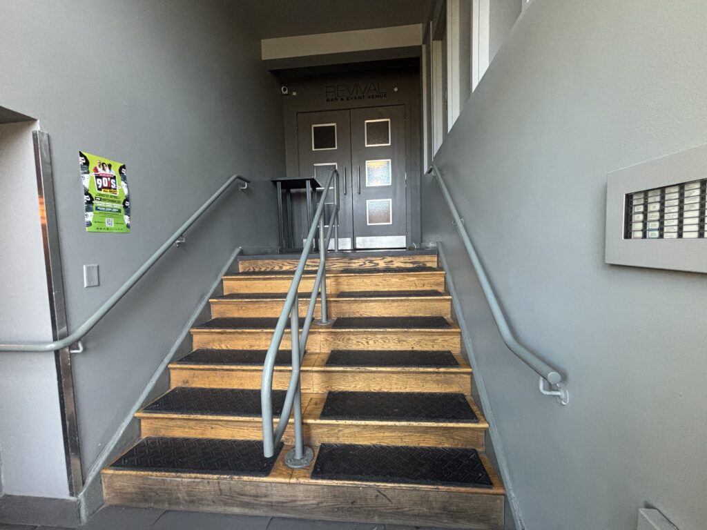 Accessibility Info: Revival Event Venue is not a fully physically accessible space. Entry requires one step at the front door, followed by six interior steps leading to the main venue. Each step is wooden with a rubber tread, with railings on both sides and in the centre. An accessible washroom is located to the left of the stage. If you require assistance, please contact us in advance at info@tdt.org.